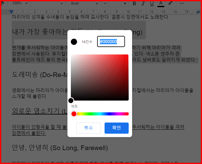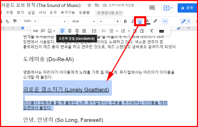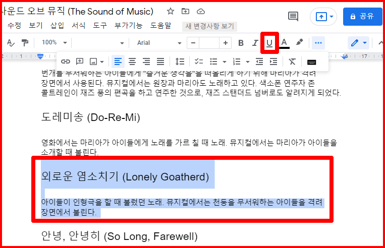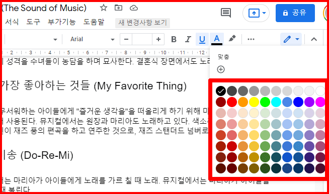 구글문서에서 문자 색 지정과 줄 긋기