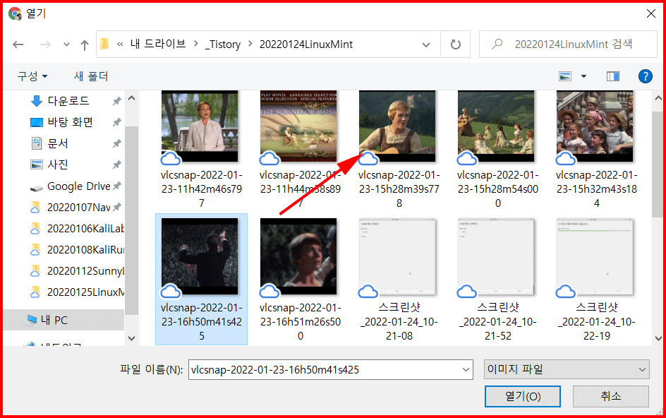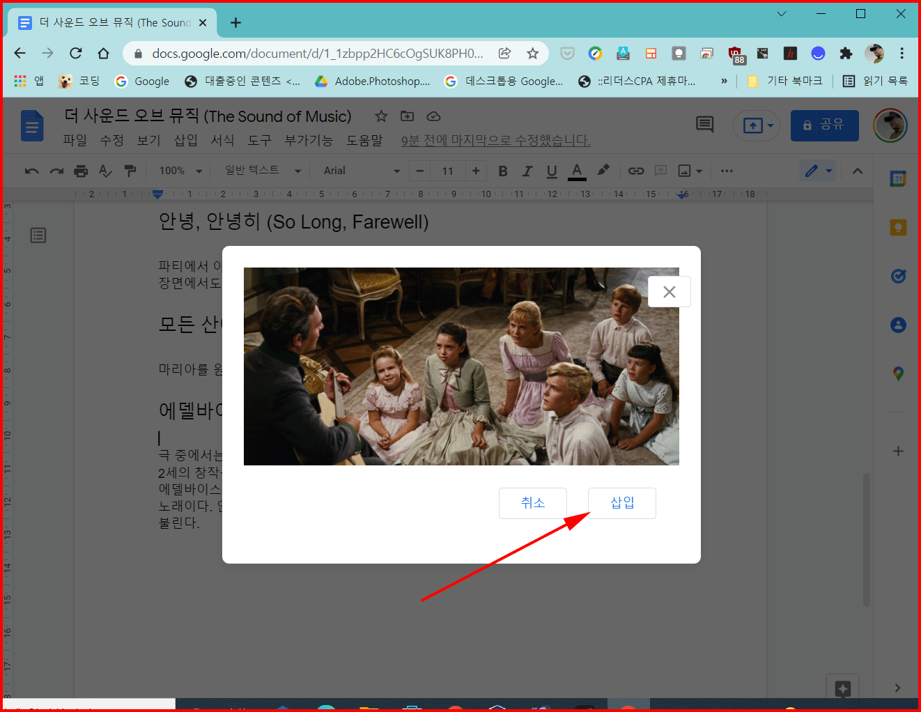 파일을 선택하여 '열기' 버튼을 클릭하면 커서가 위치한 지점에 이미지가 삽입됩니다. 아래 그림은 '쥴리 앤드류스'가 아이들에게 '도레미송'을 지도하는 사진이 입력됐군요.