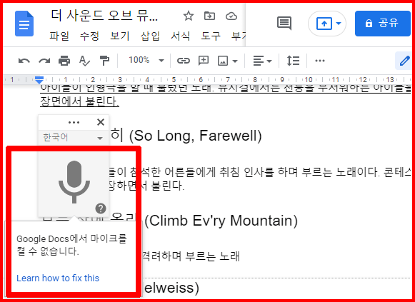 마이크가 정상 작동된다면, 구글문서에서 마이크 사용 권한을 요청하는 대화 상자가 표시되면 '허용' 버튼을 클릭합니다. 그러면 '마이크 버튼'이 활성화됩니다.