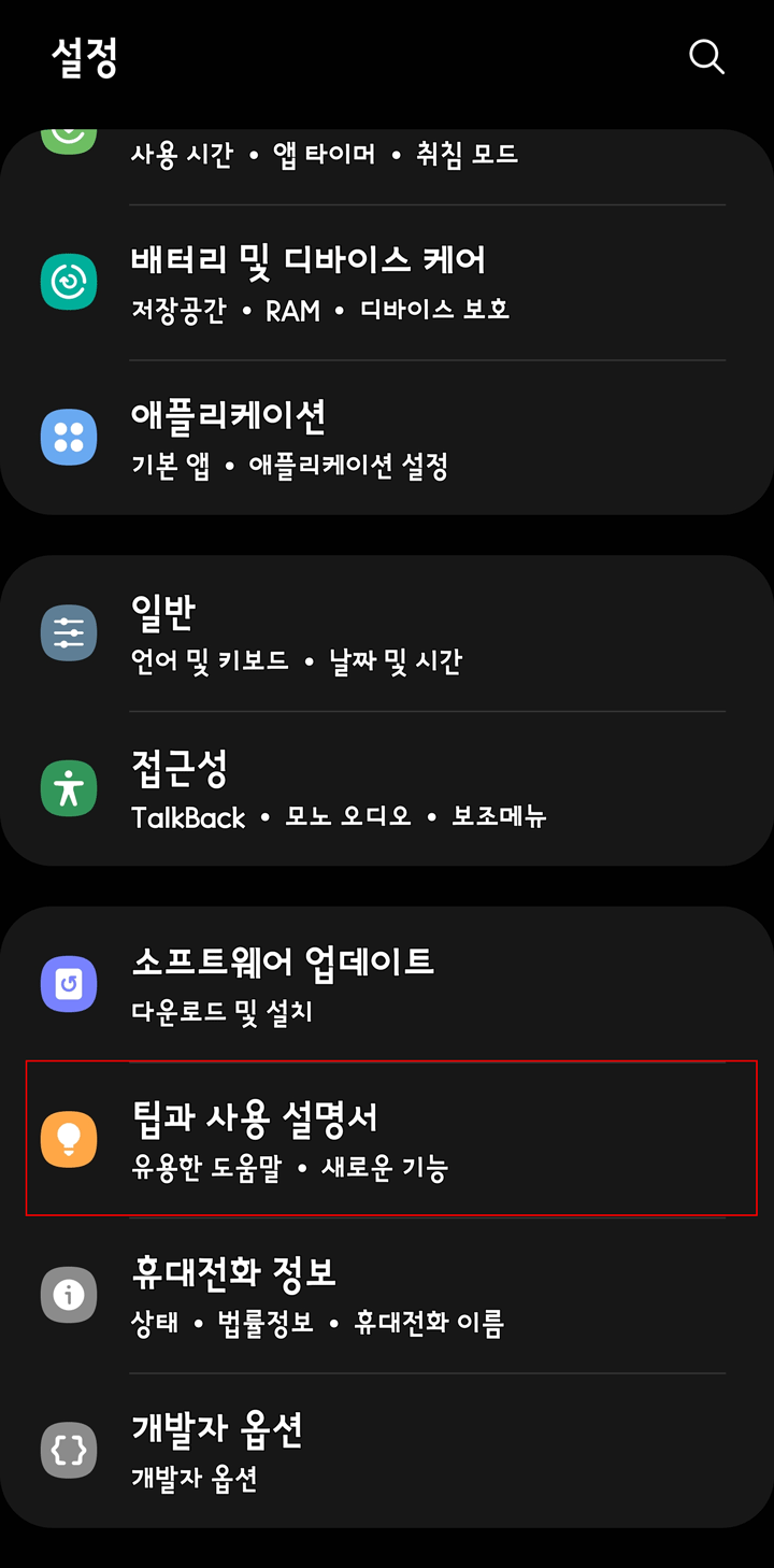 화면 상단에서 손가락을 이용해 아래로 스크롤하면 퀵패널이 보입니다. 그 위에 오른쪽 가장자리에 톱니바퀴 모양의 설정 아이콘이 있습니다. 이것을 선택해 보십시오. 그러면 위와 같은 설정창이 나오고 아래쪽에 [팁과 사용 설명서]가 있습니다.