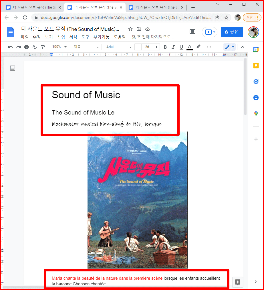 구글 문서에서 제공하는 문서 번역 기능을 이용하면 다양한 외국어로 번역이 가능합니다. 지금 작성 중인 '사운드 오브 뮤직'에 관한 구글 문서를 영어, 프랑스어, 그리고 일본어로 번역해 보겠습니다.