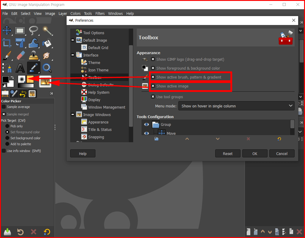 도구상자(Toolbox)도 조정하겠습니다. 활성화된 붓, 무늬, 그라디언트 표시를 체크하고 활성화된 이미지 표시도 켜겠습니다. 기본 환경에서는 아래 두 가지는 체크가 해제되어 있습니다.