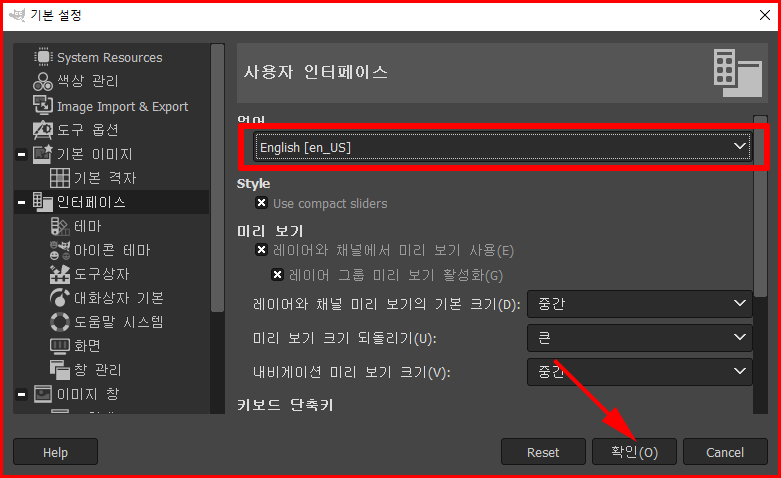 '편집' 메뉴의 기본 설정에서 '인터페이스' 항목에는 사용자 환경을 정하는 중요한 내용이 있습니다. 우선 사용 언어를 영문으로 바꾸겠습니다. 이것에 관한 내용은 이미 '그래픽 툴 GIMP 메뉴 영문화'에서 소개한 바 있습니다.
