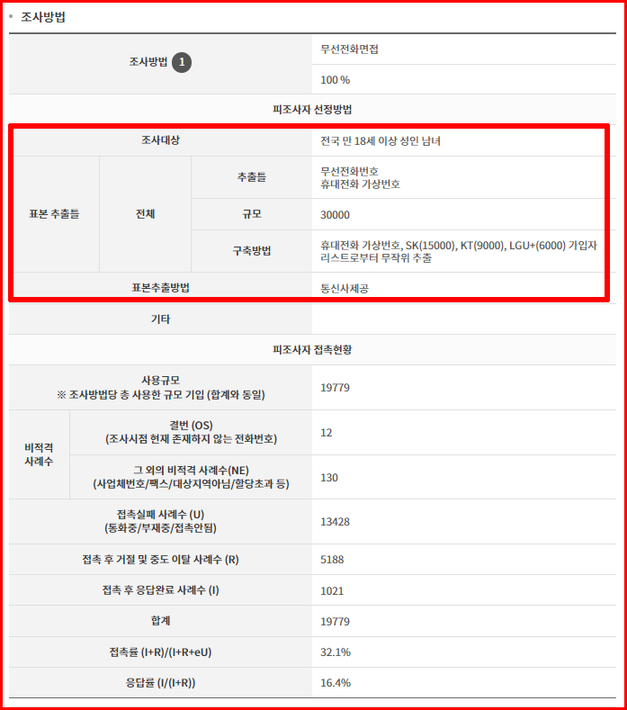 서던 포스트 여론 조사의 조사방법에 대한 것입니다. 조사 대상은 '전국 만 18세 이상 성인 남녀'로 무선전화로만 조사됐다. 30,000개의 전화번호 가운데 최종 연결된 1,021명의 결과를 표본으로 해서 분석됐네요.