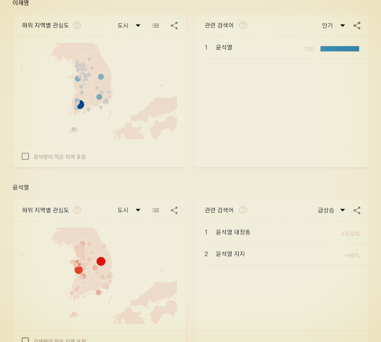 뉴스검색에서 '이재명'을 검색한 사람이 주로 '윤석열'도 검색했다는 얘기입니다. '윤석열'을 검색했던 사람들이 주로 '윤석열 대장동'을 많이 검색했고, '윤석열 지지'를 검색한 경우가 뒤를 이었다는 경우가 되겠습니다.