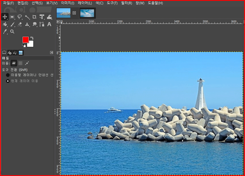 김프를 실행합니다. 다운로드 한 방파제 사진을 먼저 불러 옵니다.
