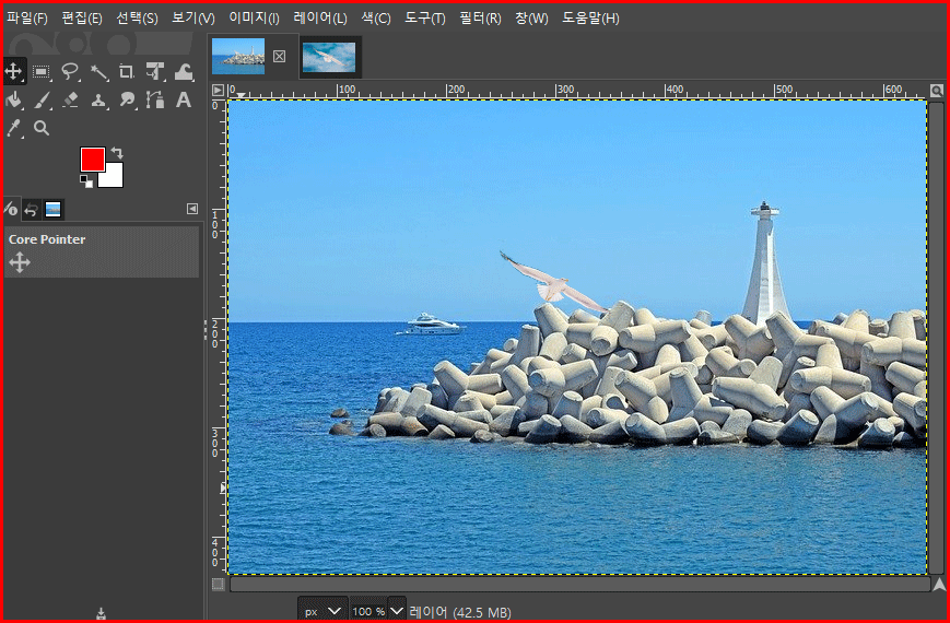 그 가운데는 이미지를 복사해서 그대로 다른 이미지에 옮길 수 있는 도장 툴도 있습니다. 이 툴을 이용하여 아래 방파제 사진에 날아 오르는 갈매기를 합성하겠습니다.