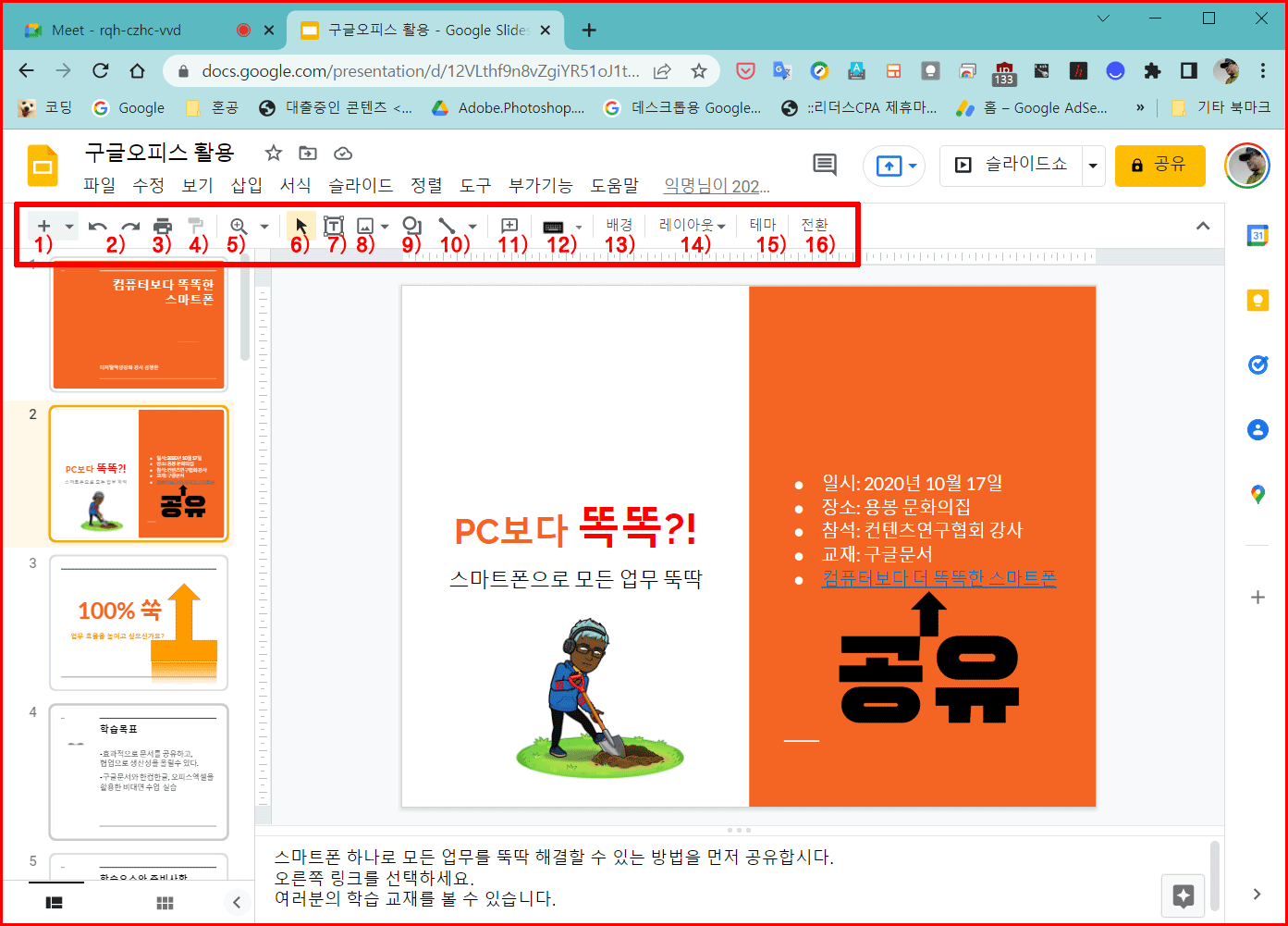 - 메뉴: 구글 프레젠테이션 명령을 기능별로 구분하여 제공합니다.