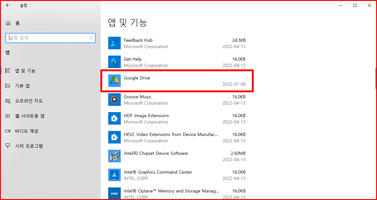 제어판의 '앱 및 기능'에서 '구글 드라이브'를 선택하여 확실하게 '제거'해야만 구글 드라이브에 대한 모든 정보가 사라집니다. 물론 리부팅까지 진행하여 더 이상 흔적이 남지 않도록 세심한 주의가 필요합니다.