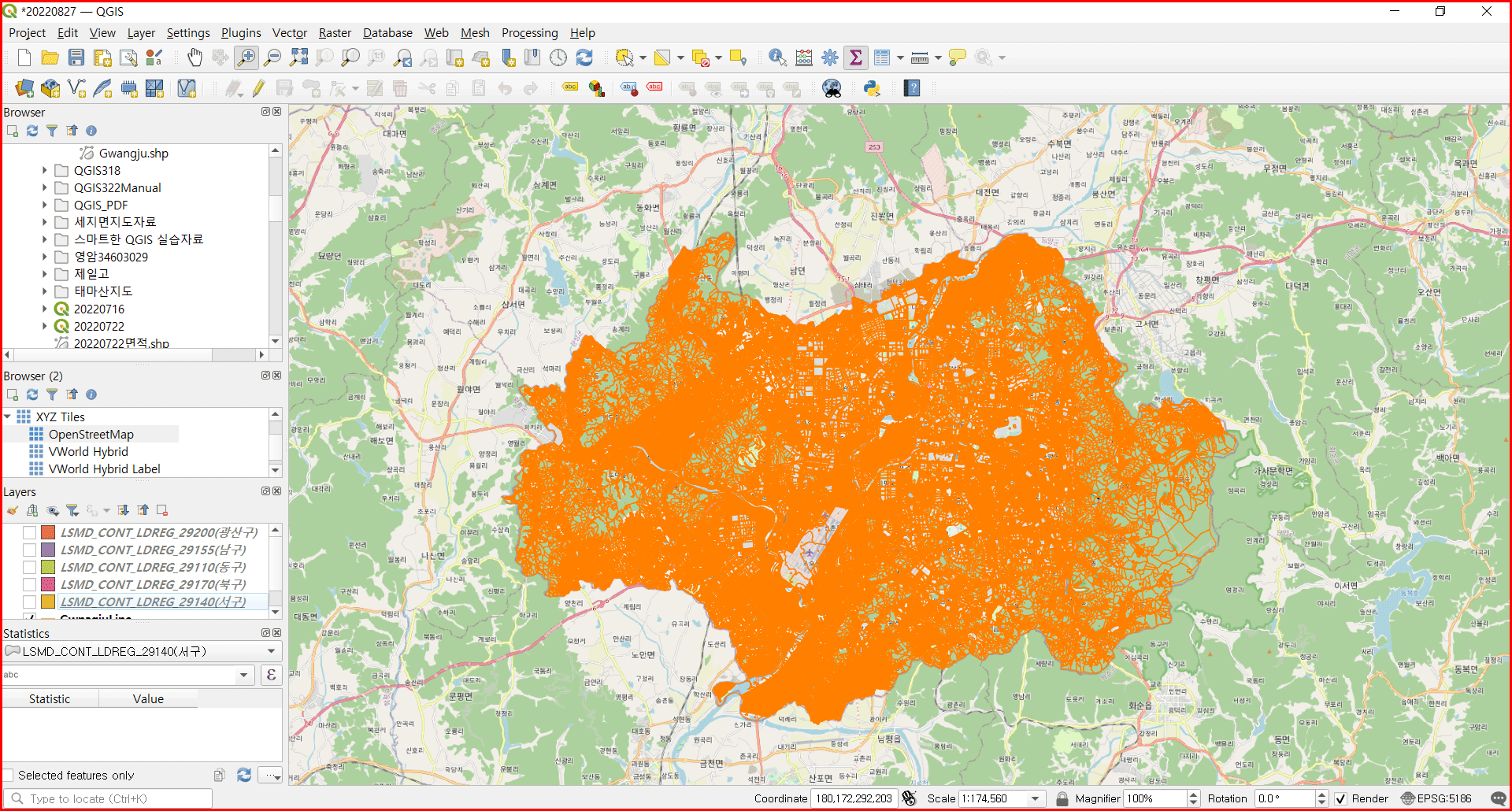 레이어 패널에 올린 레이어들은 아래에서 위로 순서대로 쌓이게 됩니다. 아래 화면은 'OpenStreetMap' 배경 지도 위에 광주광역시 연속도가 올라온 것입니다.
