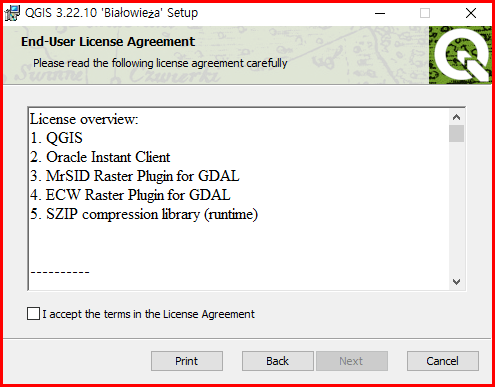 QGIS 홈페이지에서 파일을 다운로드합니다. 실행하면 아래와 같은 창으로 동의 여부를 묻습니다. 동의하고 설치를 진행합니다.