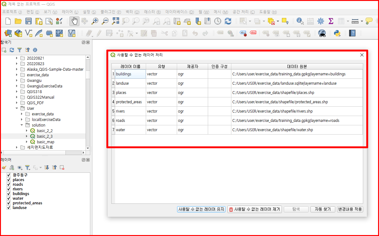우선 전 시간에 학습했던 파일을 불러옵니다. 컴퓨터 환경이 바뀌면 레이어의 경로가 다르기 때문에 바로 불러오지 못하고 경로를 찾는 과정이 진행됩니다.