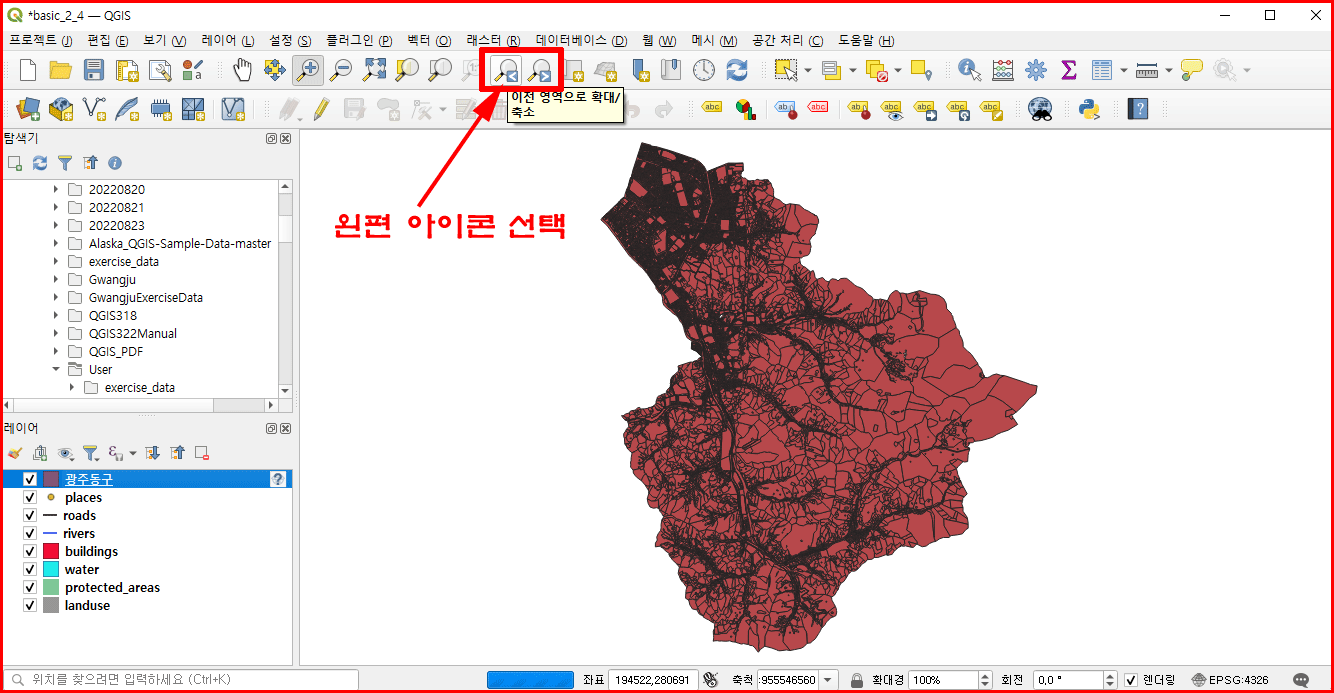 참, 광주 동구 지역 레이어를 보다가 스웰렌담 지역으로 다시 돌리는 방법은 간단합니다. 다시 레이어를 선택해서 그 레이어에 맞게 '확대/축소'를 선택해도 됩니다. 그러나 그렇게 레이어를 옮기다 보면 아까 만났던 화면과는 다르게 됩니다.