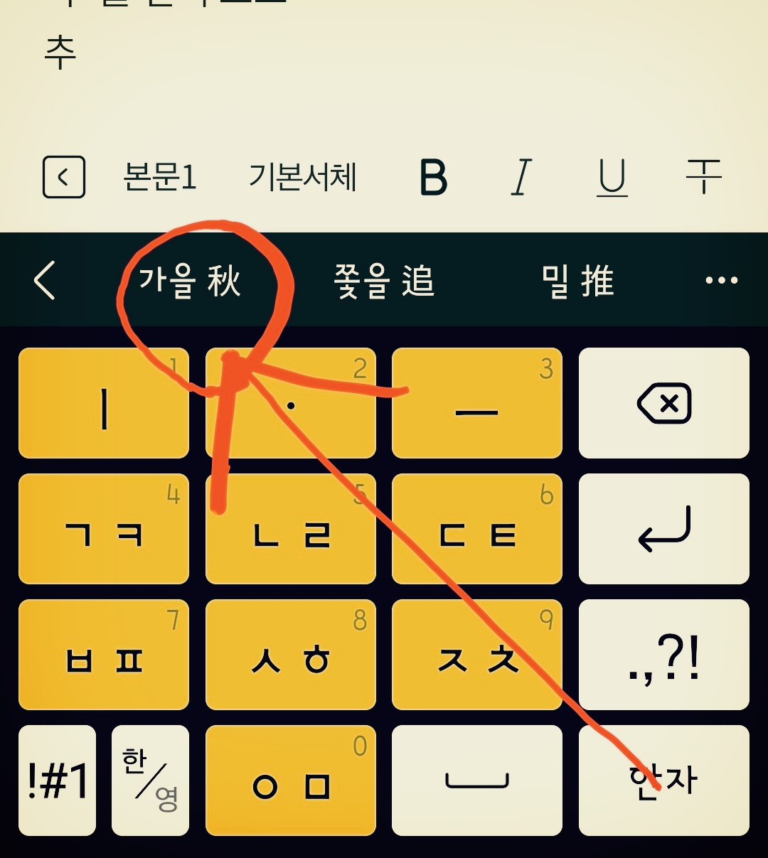 '추'를 먼저 쓰고 '천지인 키보드' 우하단 키를 지그시 누릅니다. 길죽하게 보이는 쿼티키보드는 왼쪽하단의 쉼표 키가 그 기능을 합니다. 학습 전에 손가락 박수 세 번째 지압 박수가 그 동작입니다. 튀어나오는 12개의 키 가운데 '한자'를 선택하세요.
