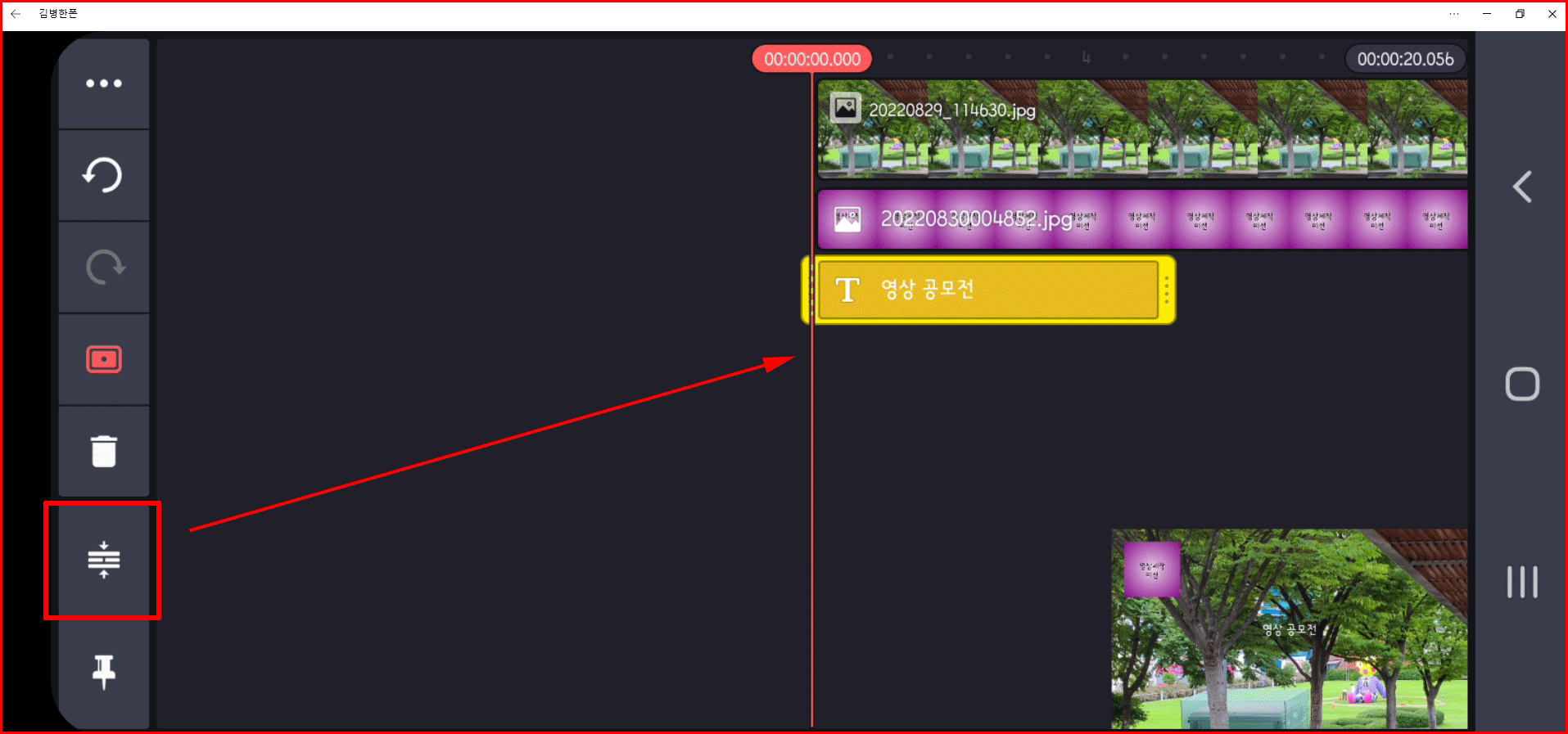 4. 타임라인 위주 화면 조정: 타임라인에 배치된 클립이 많아지면 타임라인 위주로 화면을 조정할 수 있습니다. 조정하는 아이콘은 왼쪽 패널에 있습니다. 다시 아이콘을 탭 하면 원상회복됩니다.
