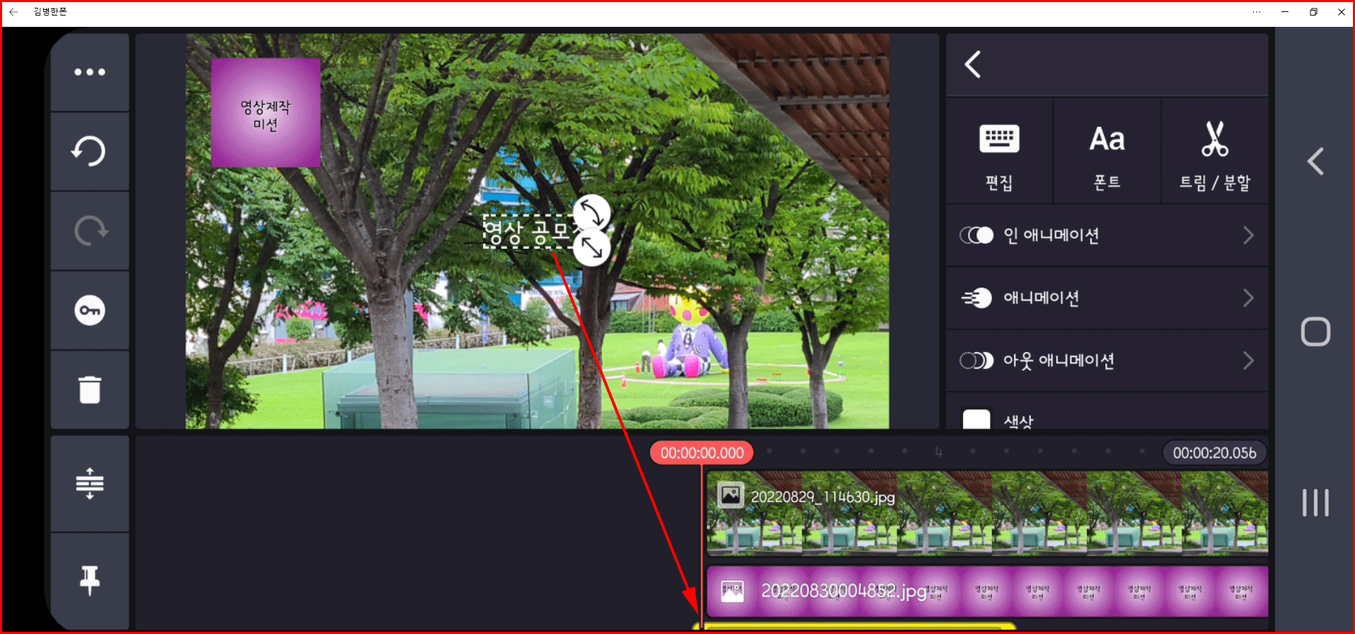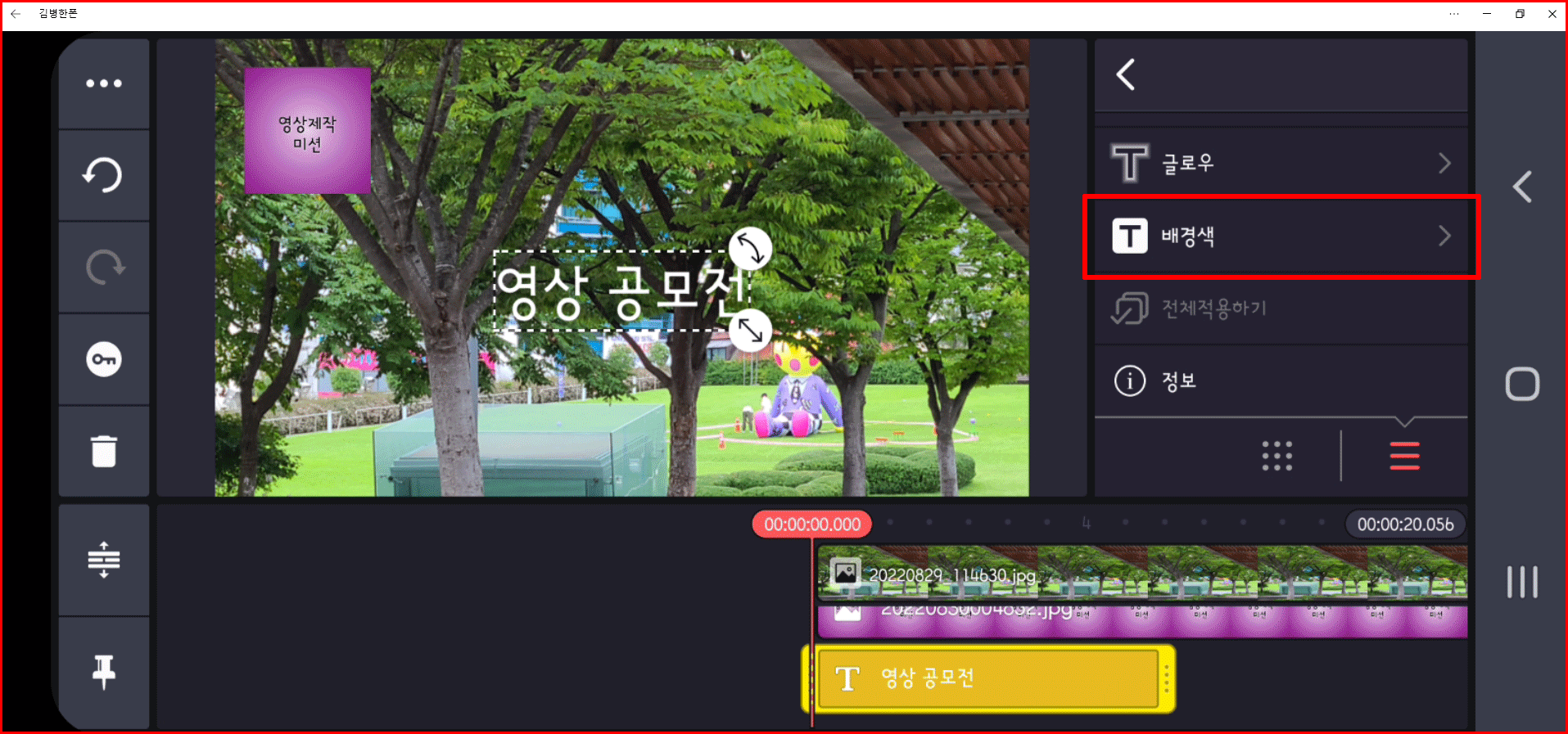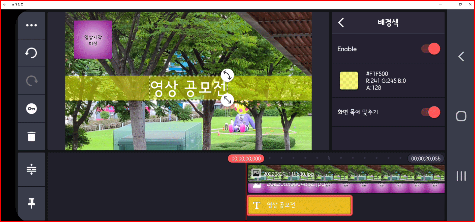우선 기본 미디어 클립을 20초로 늘렸습니다. 로고 사진도 계속 나오게 클립 시간을 조정했습니다. 조정하는 방식은 클립을 선택하여 노란 테두리 끝을 지그시 누르고 시간을 늘리면 됩니다.