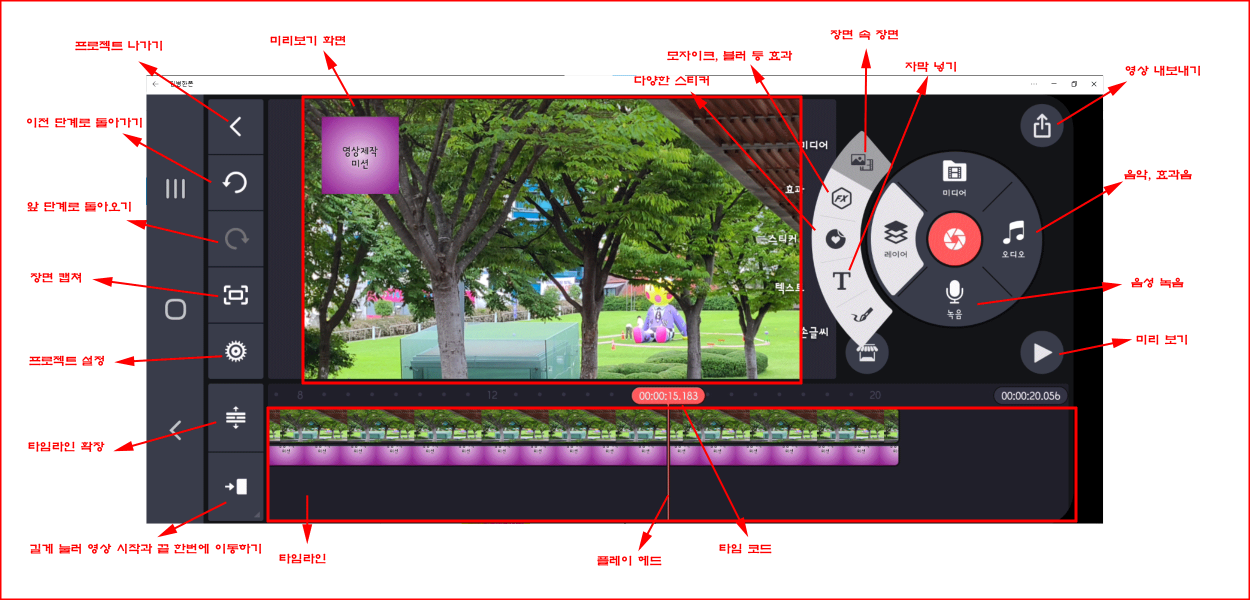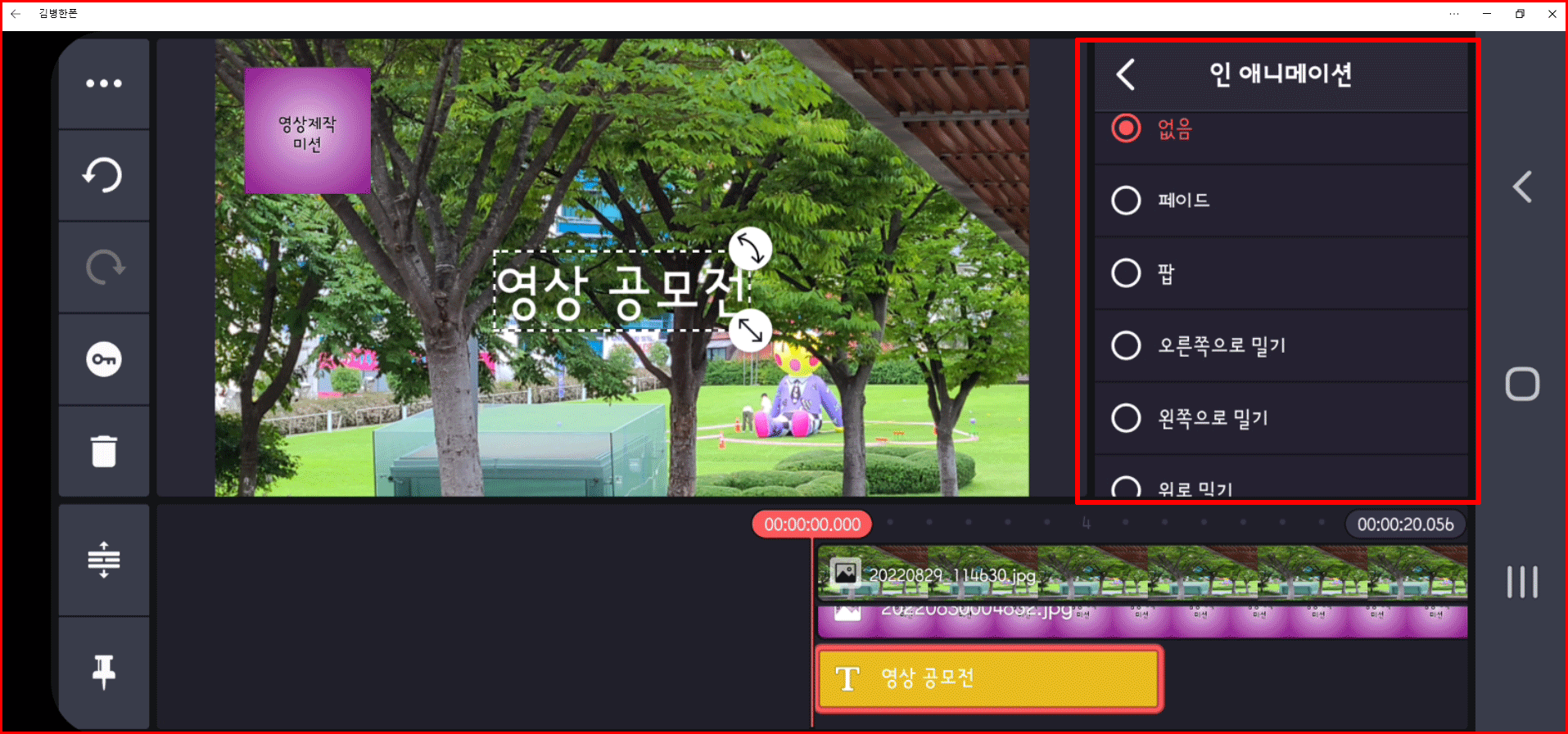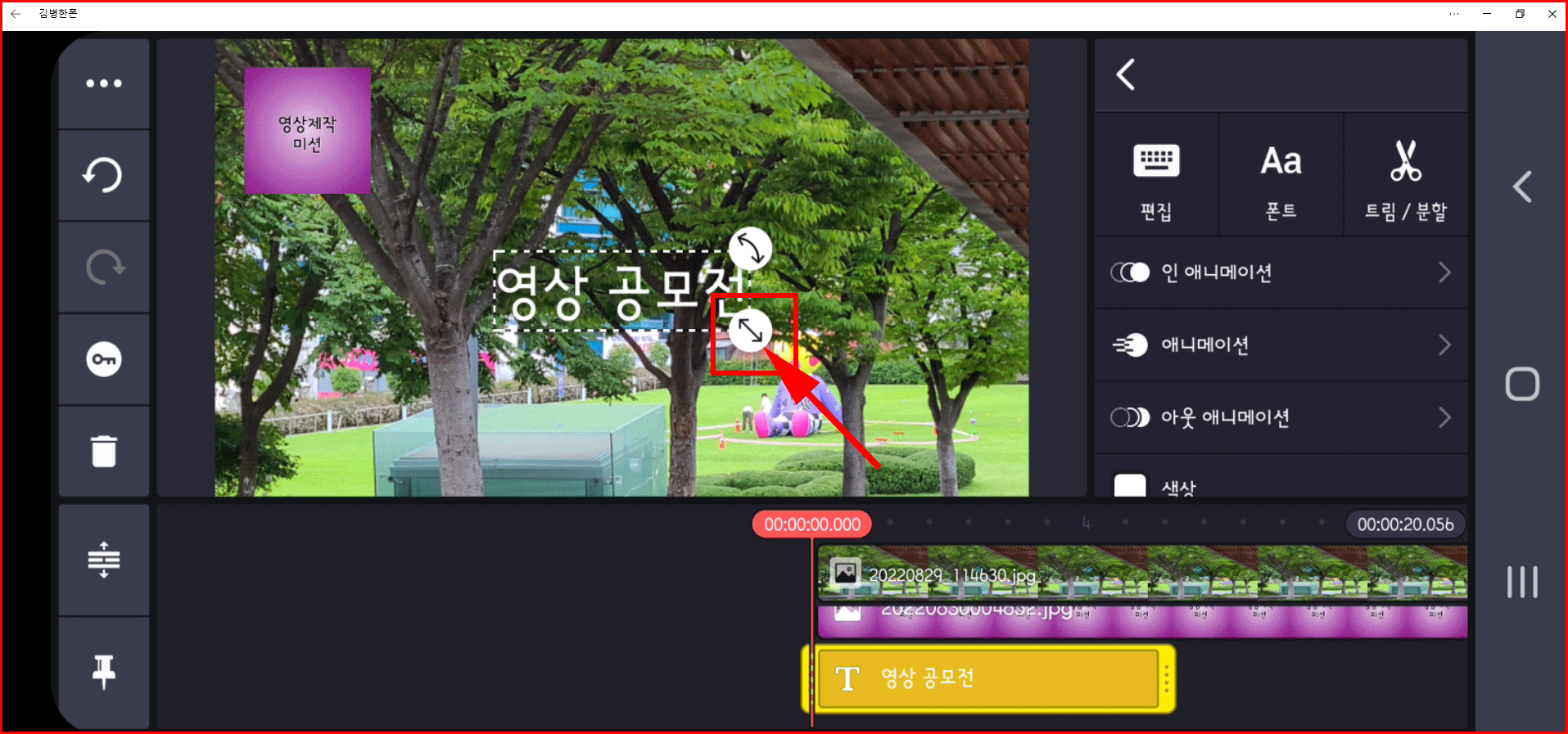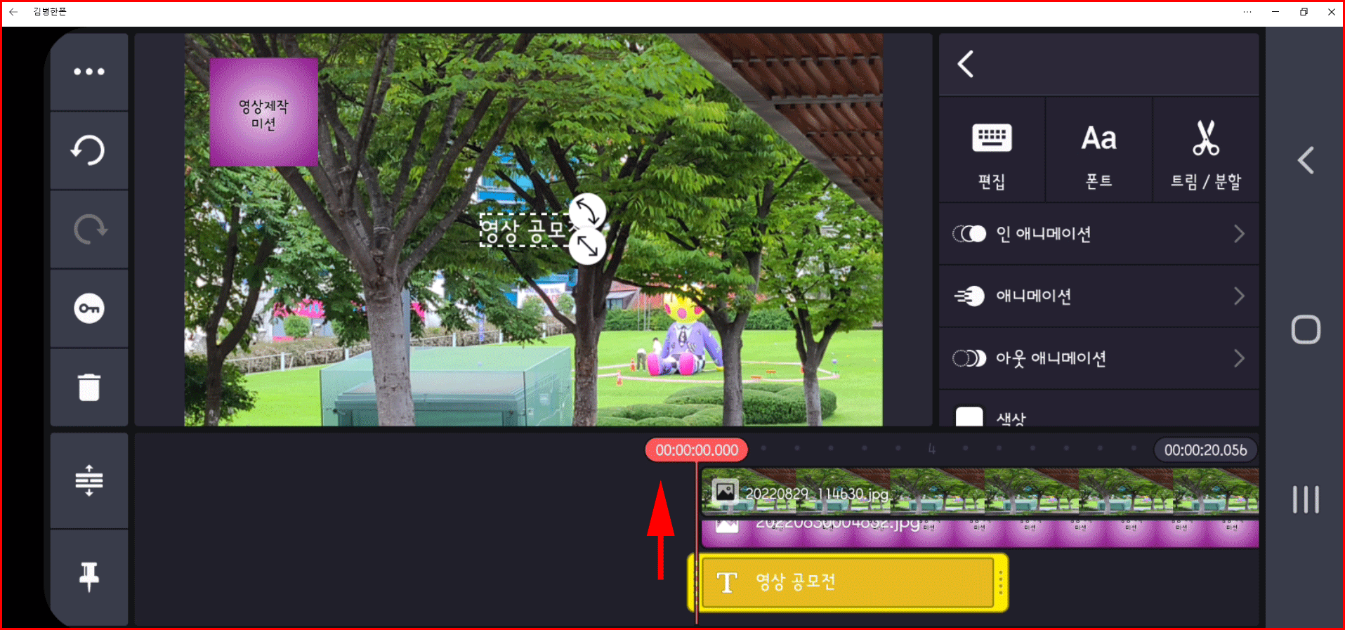 우선 기본 미디어 클립을 20초로 늘렸습니다. 로고 사진도 계속 나오게 클립 시간을 조정했습니다. 조정하는 방식은 클립을 선택하여 노란 테두리 끝을 지그시 누르고 시간을 늘리면 됩니다.