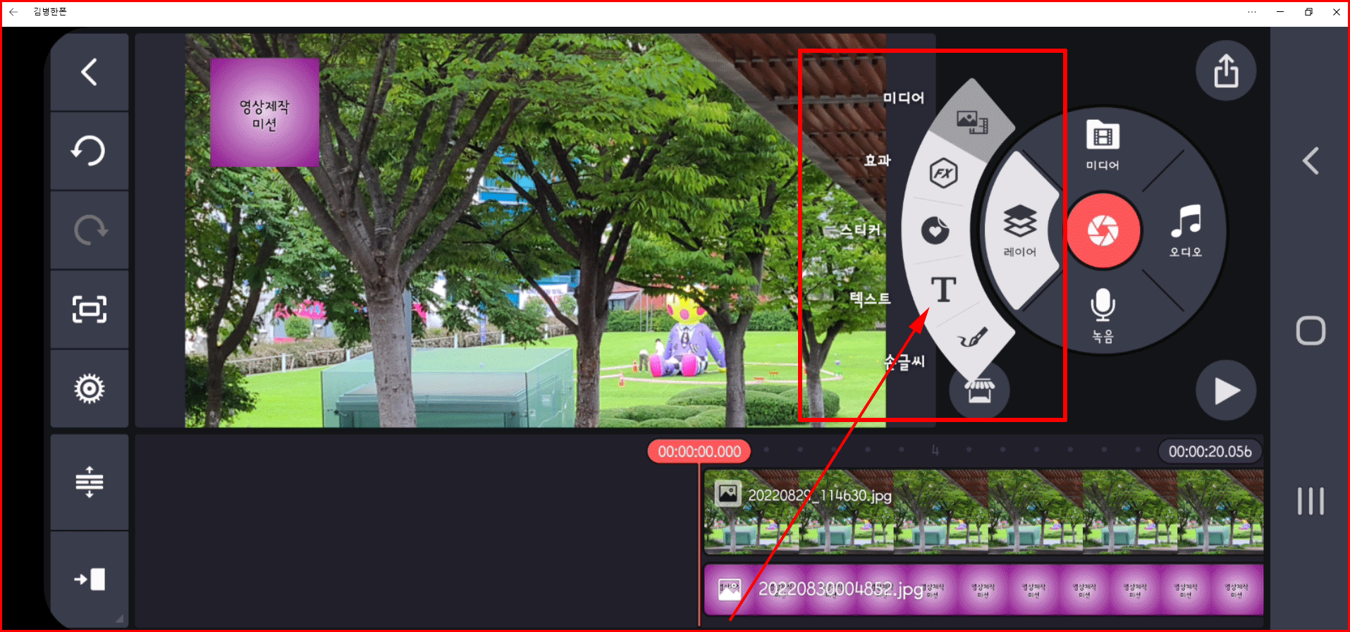 1. 미디어 버튼에서 텍스트 선택: 선택한 텍스트는 타임라인 제일 아래쪽에 배치됩니다.