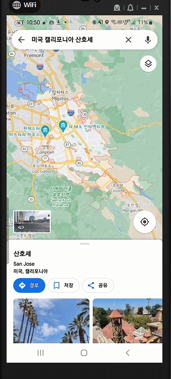 구글지도 어플을 실행합니다. 검색창에 [산호세]를 입력하고 검색합니다. 언어에 구애를 받지 않고 검색되는 것이 신기합니다. 그만큼 언어간의 장벽이 낮아졌다고나 할까요. 쉽게 [미국 캘리포니아 산호세]를 찾습니다.