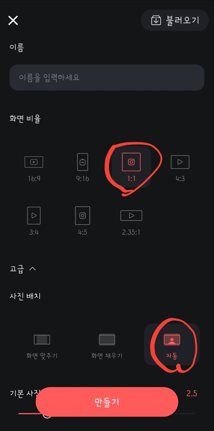 만들기 설정에서 '고급'을 탭 합니다. '사진 배치'에서 '자동'을 택합니다. 사진 보여주는 시간도 조정합니다. 저는 '2.5초'로 확 줄였습니다.