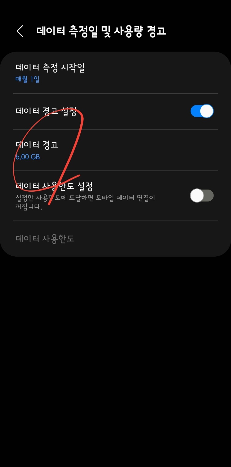 이어지는 화면입니다. 기본은 6G로 돼있는데, 그것을 탭 하여 수정합니다. 자신의 폰에 허용된 데이터를.