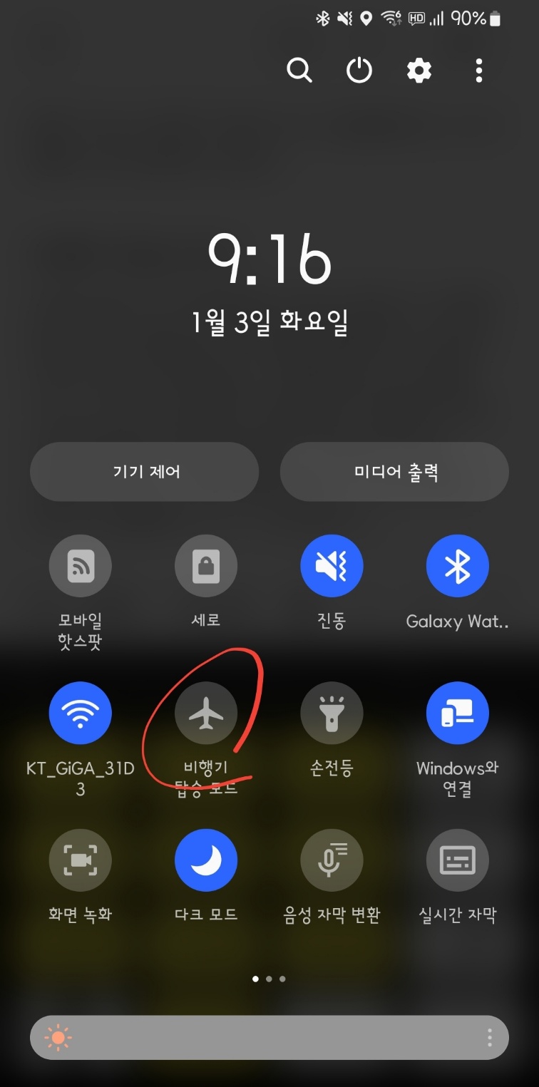 비행기 모드 실행과 동시 차단됐던 와이파이, 블루투스를 다시 선택하면 두 기능 모두 활성화되면서 사용이 가능합니다.