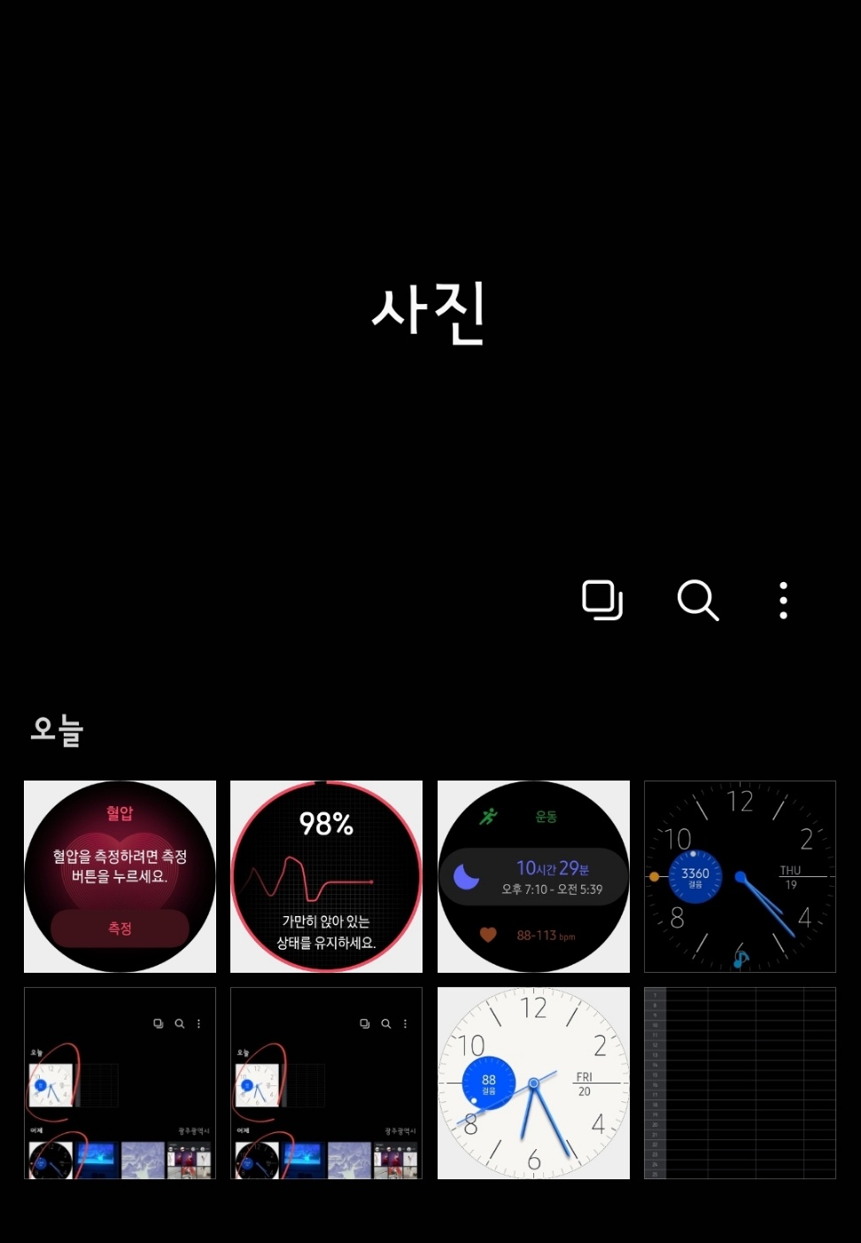워치 화면 캡처는 워치의 두 버튼을 동시에 누릅니다. 스마트폰 갤러리에서 확인할 때는 '사진' 별로 할 때와 '앨범'으로 할 때 차이가 있습니다.
