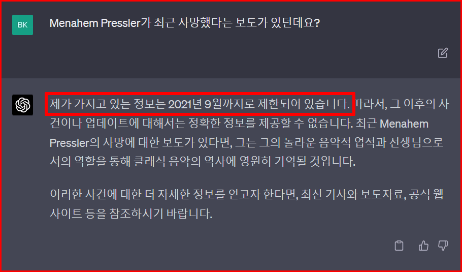 위 질문을 ChatGPT에 올렸을 때는 다음과 같이 사망 사실을 알지 못했습니다.