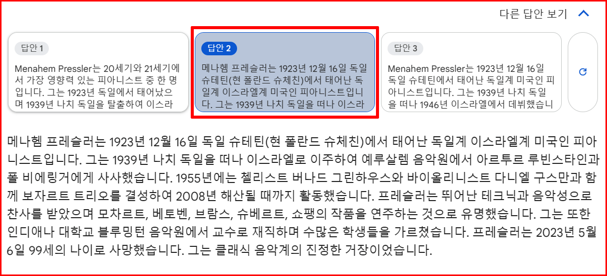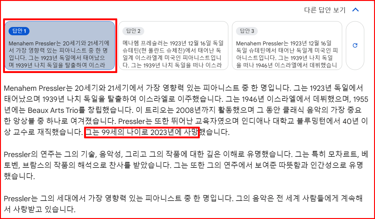 5월 6일 타계한 음악가 Menahem Pressler에 대해 물었습니다. '음악전문가 입장'에서 대답을 해달라고 질문을 했습니다. 놀랍게도 사망 사실을 정확하게 진술하고 있습니다.