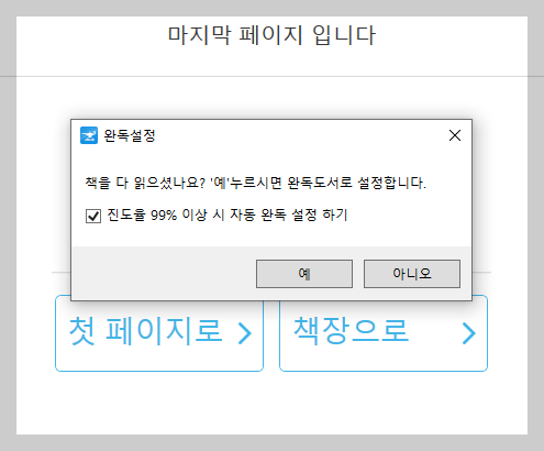 독서 진행 과정을 체크해주기 때문에 중간에 책갈피를 끼워두지 않아도 편하게 책을 읽을 수 있습니다. 책을 99% 이상 읽게 되면 다음과 같이 완독 도서로 기록을 합니다.