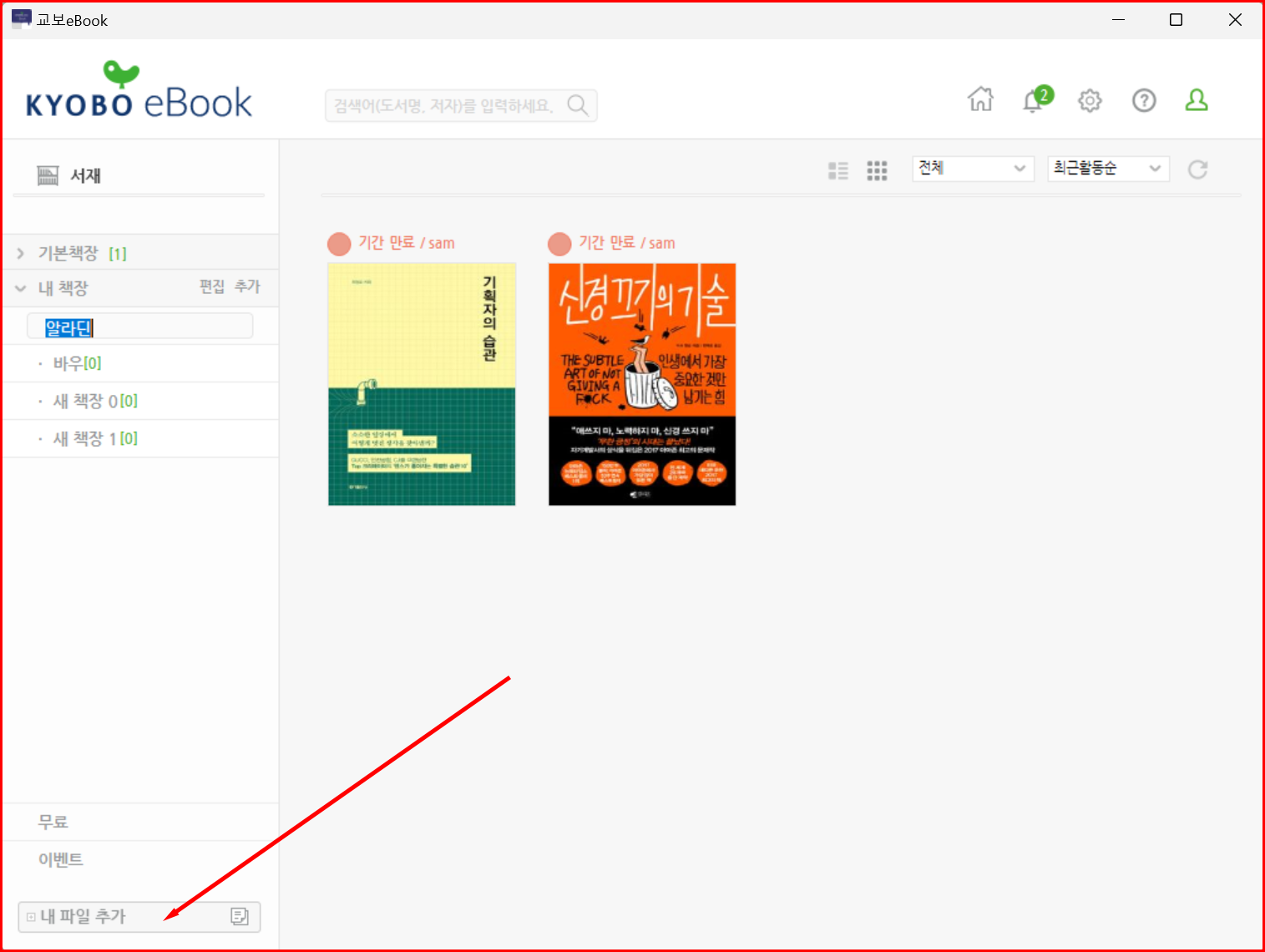 재인증을 거쳐 내 노트북에 뷰어를 설치하고 내 책장을 들여다보니 기간만료된 두 권의 책이 보입니다. 교보문고 뷰어에서도 자신의 파일을 추가할 수 있는 기능이 있군요.