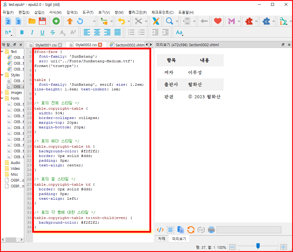 마지막 판권 페이지까지 마무리하면 모든 전자책의 구성은 끝납니다. 더 상세한 스타일 적용은 기본 스타일 파일에 자신의 취향에 따라 추가하거나 빼서 완성합니다.