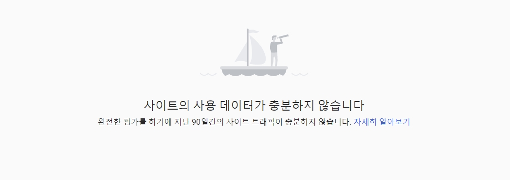 사이트 사용 데이터가 충분하지 않다는 메시지입니다. 이것을 어떻게 해석해야 할지 더 고민하도록 하겠습니다. 블로그 생성이 얼마 되지 않아서 문제인지, 제 포스트의 질이나 형식에 문제가 있는 것인지를 더 알아보도록 하겠습니다.